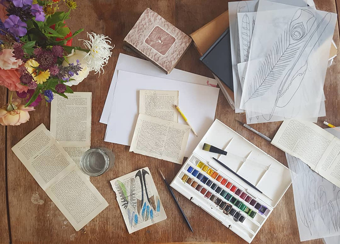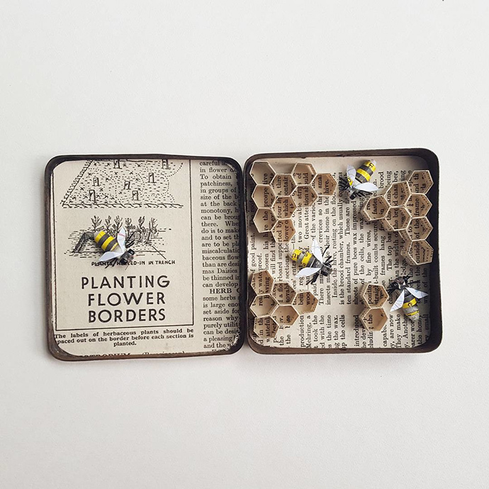 除了使用颜料来丰富作品的色彩和图案,Kate还大量使用了废旧书籍和杂志中的纸张,这让她的作品更增加了怀旧的味道。