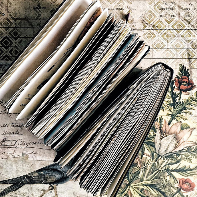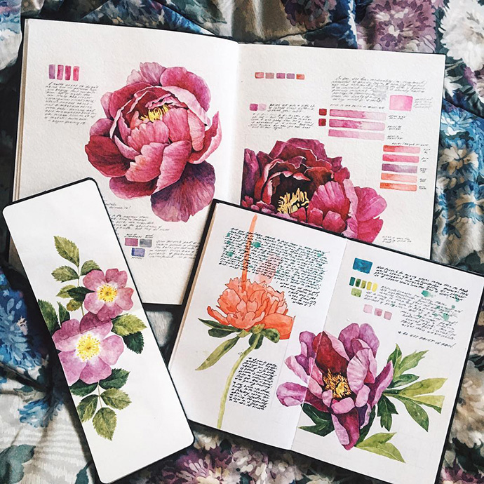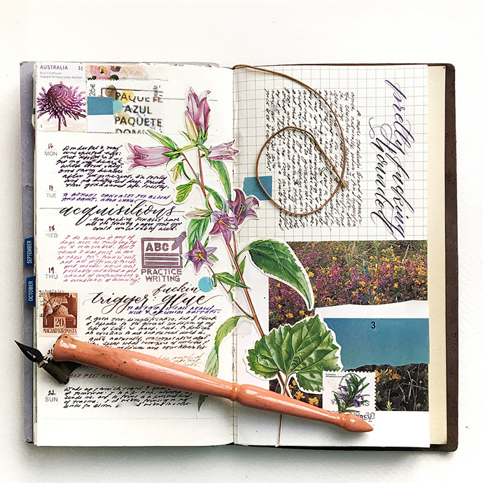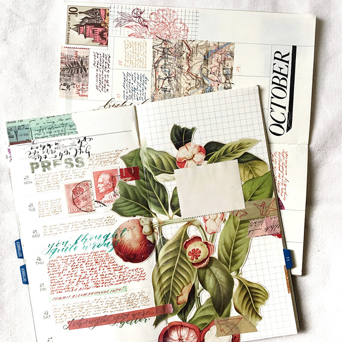 Sasha喜欢古董画片、老的插画书籍、旧邮票等等,她还有很多关于鸟类和植物学的书籍,Sasha的拼贴手账很多从这些旧纸张中取材,此外Sasha还会在手账中画上水彩画。