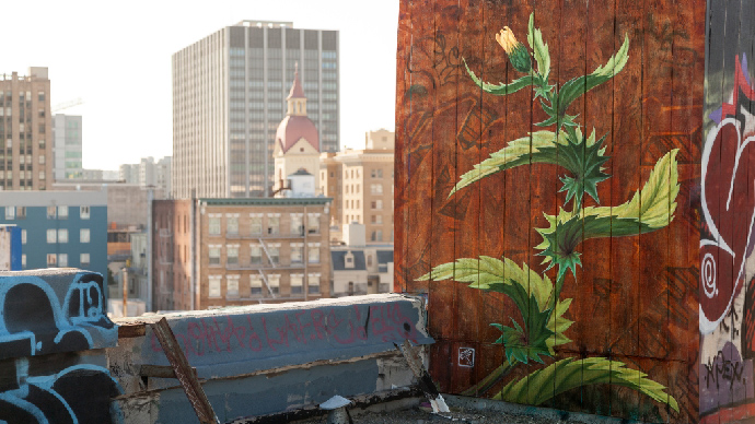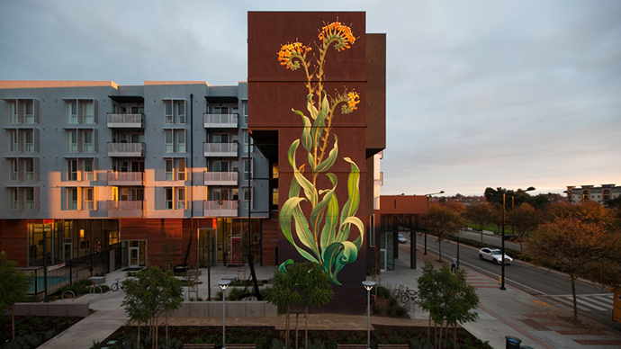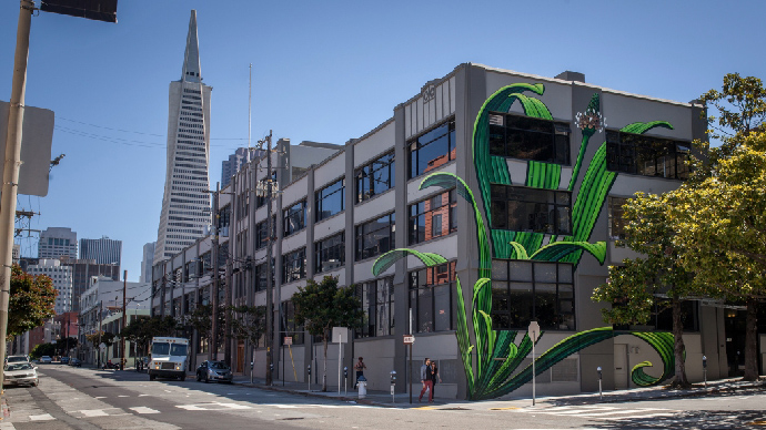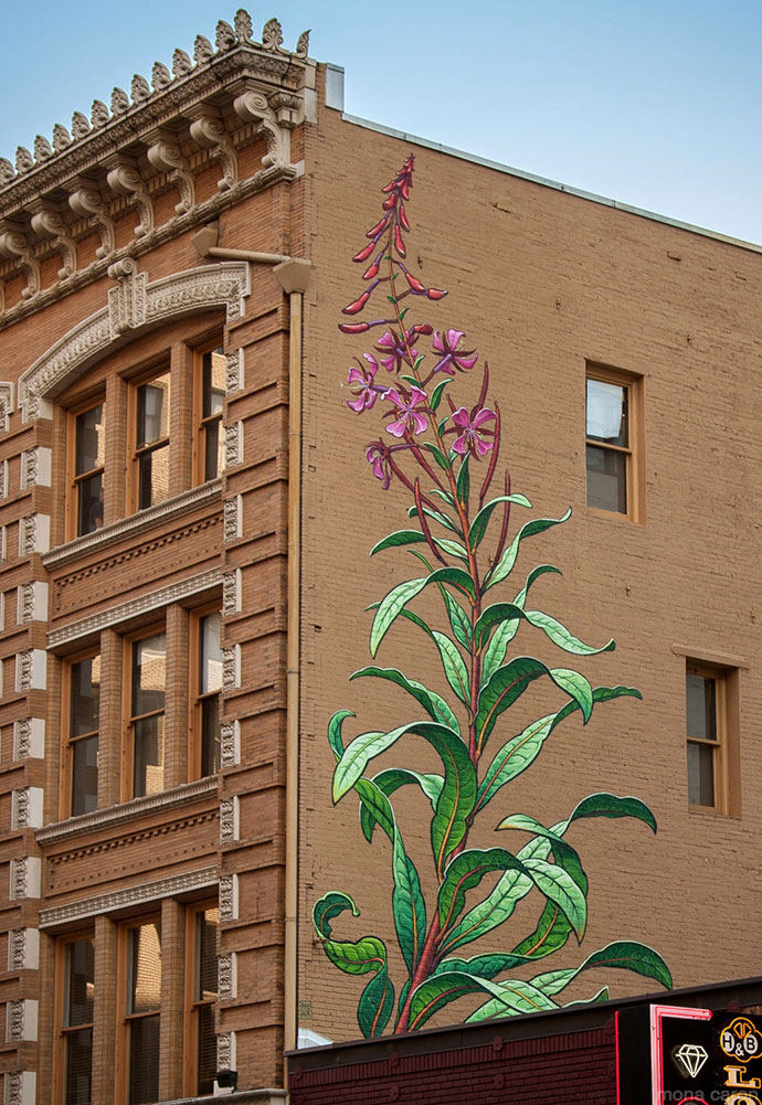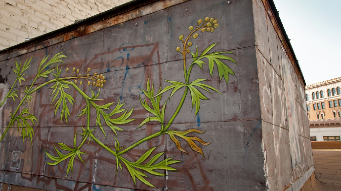 Mona Caron是来自美国旧金山的壁画艺术家,在公共空间创作巨型壁画。她的壁画作品遍及全世界数十个城市,大多以野花野草等植物为主题,她为自己的壁画取名为Weeds。