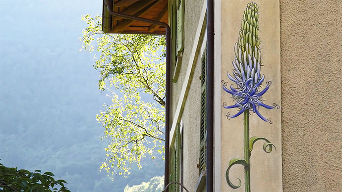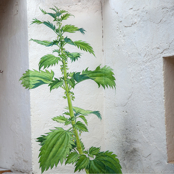 Mona原本的绘画方向是城市景观,将巨大的城市鸟瞰图缩小在画布上。而Mona现在的绘画题材则恰恰相反——将小小的杂草和野花放大到城市建筑的墙壁上。