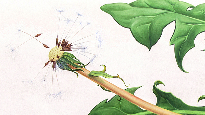 这棵蒲公英出现在瑞士的门德里西奥,除了最主要的一棵蒲公英母本,她还在当地政府的允许下,将蒲公英的种子画到了停车场,火车站等地。就像真正的蒲公英种子那样,随风飘散到更远的地方。