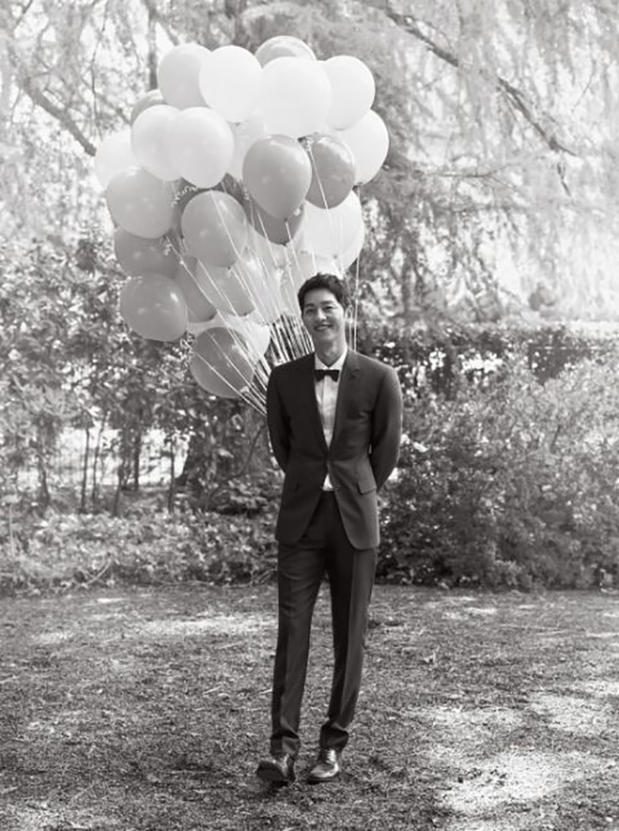 用气球充当拍摄背景,不一定将气球固定成一个特定形状摆放在身后,随意搭配几支气球,便能get到宋仲基的同款look。