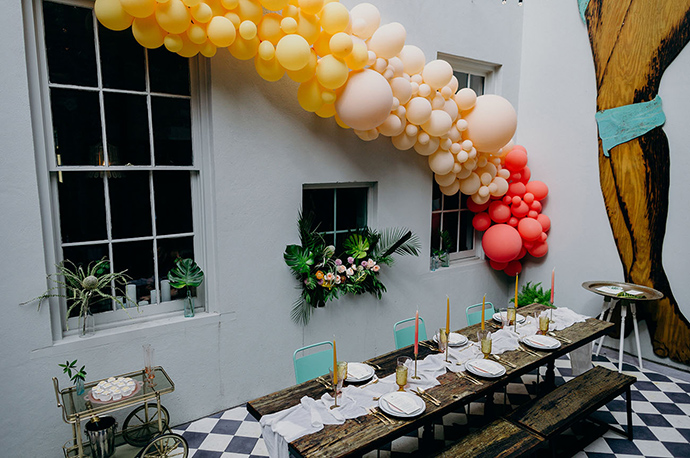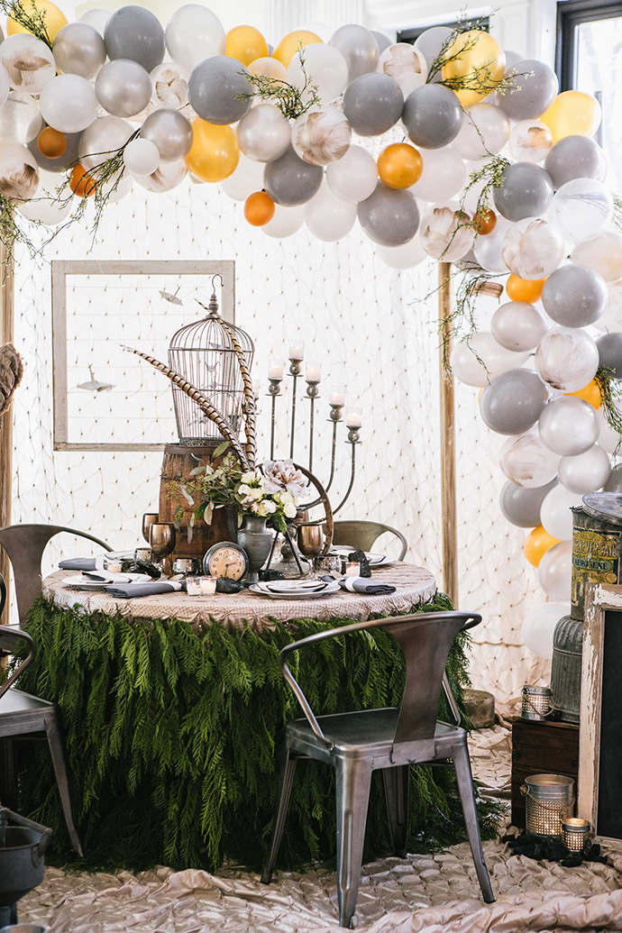 氢气球漂浮在餐桌之上,可以为餐桌布置带来浪漫轻盈的质感。那为了不让气球飞走,可以用清新的花艺盆栽将其栓牢,或用胶带粘贴到墙上。