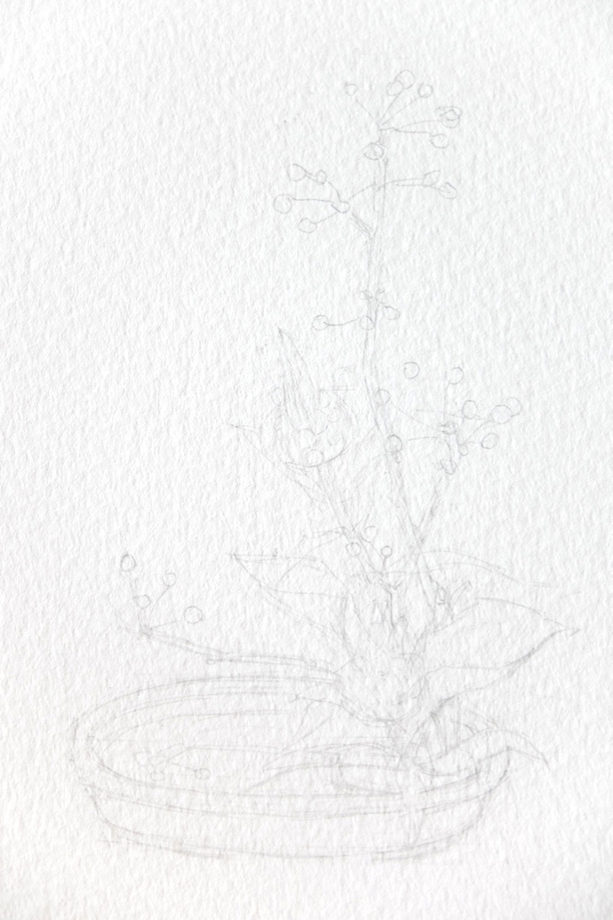 用铅笔在纸上勾勒出插花作品的大致线稿,需要注意花器和各个花材之间的比例关系,要像插花一样考虑每个花材的位置。