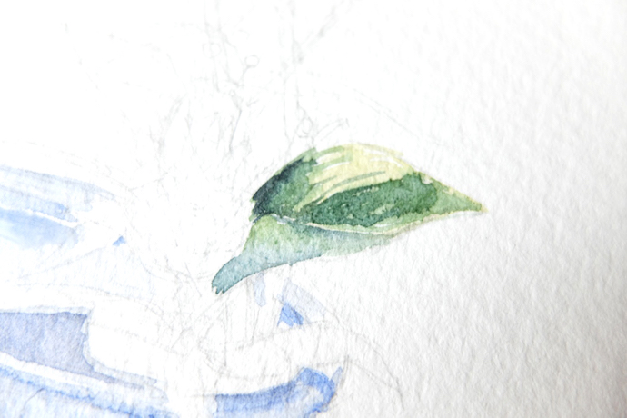 画花器,蓝色调和大量水先给花器铺一个底色,再加入少量群青加深蓝色画花器的暗部。黄色加少量绿色调和淡黄色给叶子上色,中绿画叶片内侧,加大量水调和淡绿色画叶片外侧。