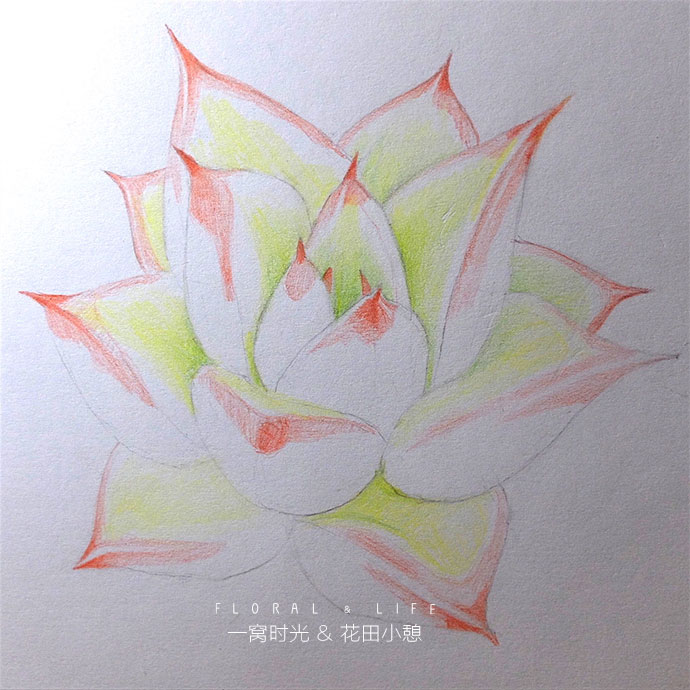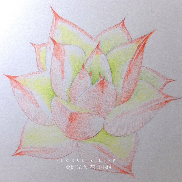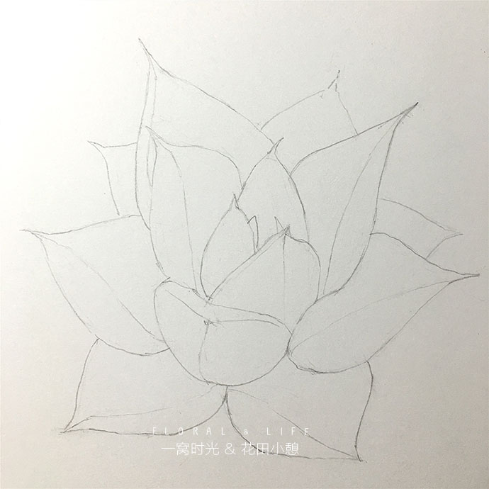 线稿:用铅笔画出乌木杂的线稿,画的时候可以先确定中间几个主要的叶片,再画周边的叶片,乌木杂的特点是下面肥,上面尖,有点像寿桃,小尖尖画到可以扎人的.