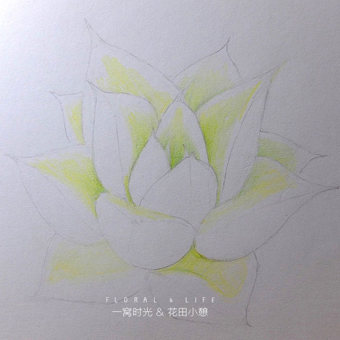 淡黄上色:用淡黄色画乌木杂的内侧,深的地方画一点草绿,注意草绿不要画太多哦,过度要自然,慢慢的融入黄色里.