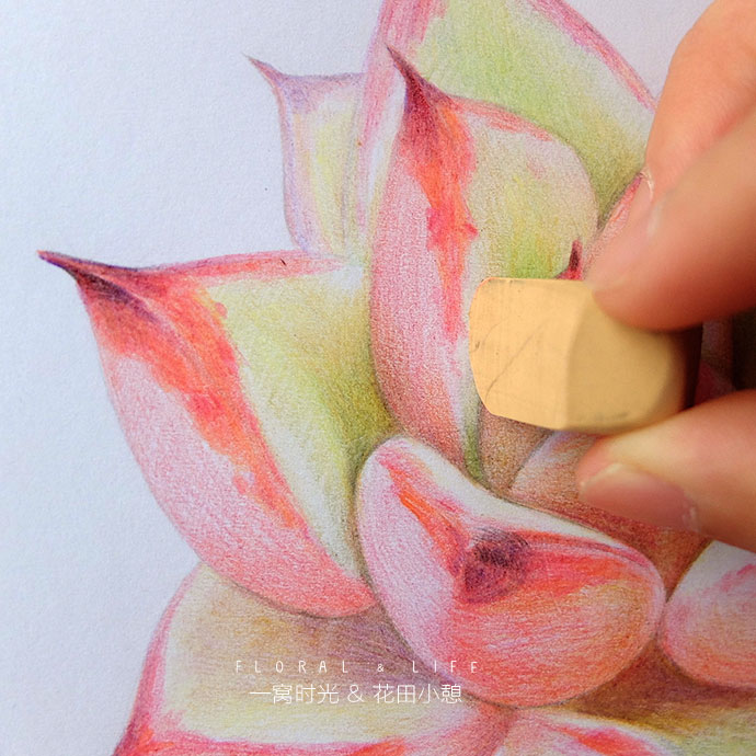 擦出高光:用橡皮把高光不够亮的地方擦亮,上色的时候不小心画到高光上的油性彩铅是可以擦掉一点的,可以把橡皮切成菱形比较好处理细节部分.