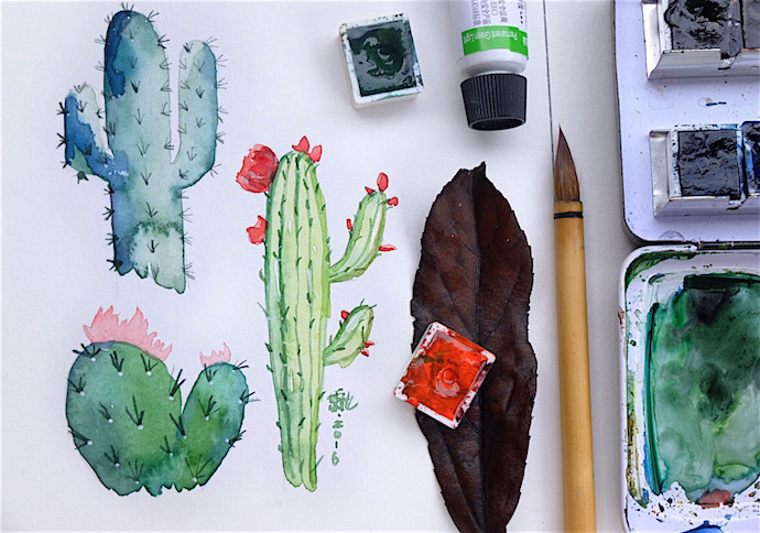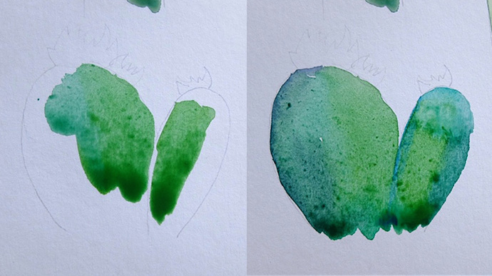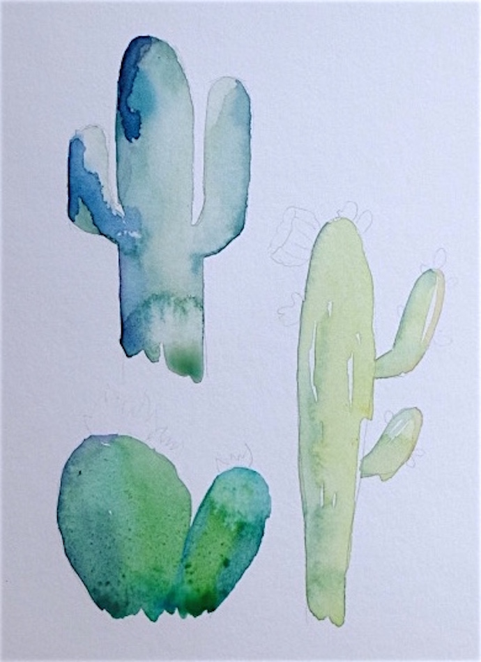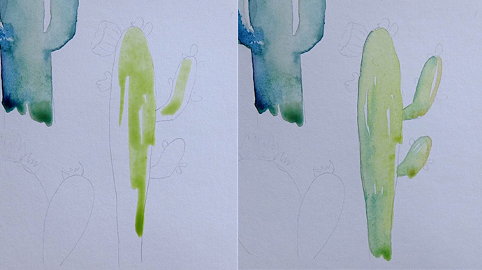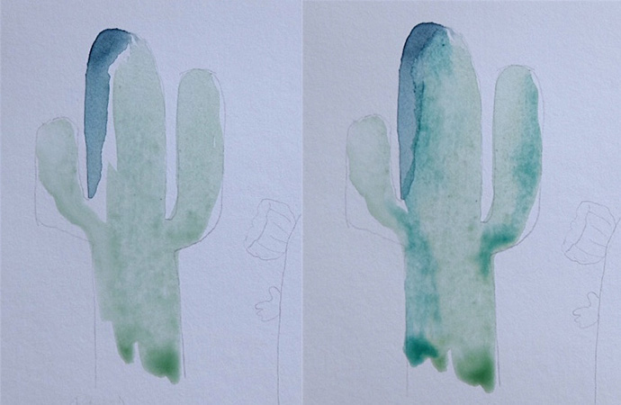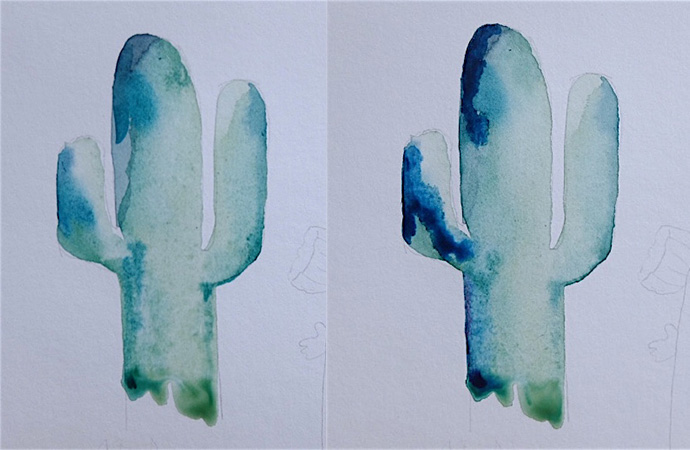 混色:在未干的时候在仙人掌边缘加深蓝色混色,让层次更加丰富,多一些渐变的效果。