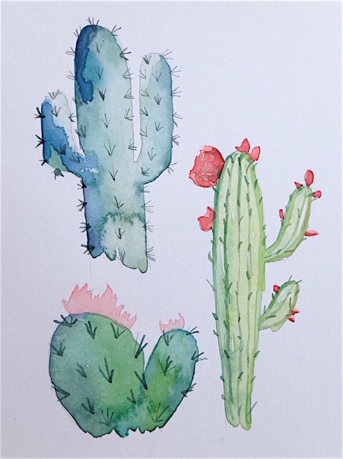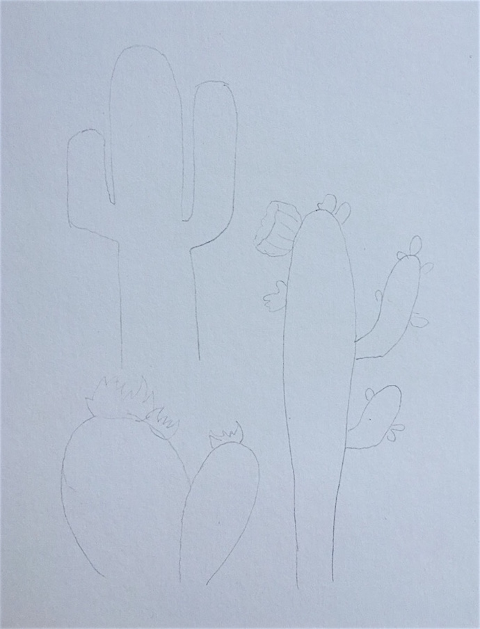 线稿:用铅笔简单勾勒一下三颗仙人掌的线稿,隐约可以看见轮廓即可,画重的铅笔线稿需要用橡皮擦淡一点,这是因为等会儿上色的时候,不会因为水彩盖不住铅笔线稿而显得脏。