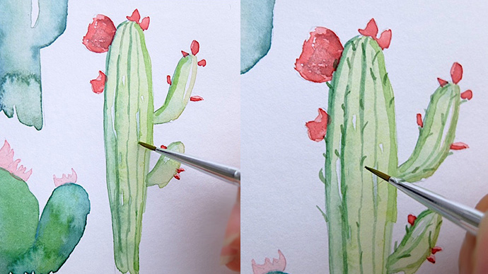 刻画浅色仙人掌:调一个深绿色用勾线笔先画出仙人掌的纹路,然后再用笔尖画纹路上的刺,如果没有勾线笔用牙签蘸取颜色也可以画刺哦,注意变化,不要大小粗细一样了。