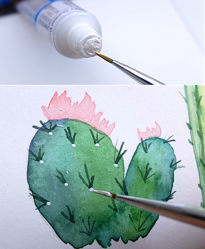 画刺的白毛毛:最后给绿色仙人掌的刺点缀白毛毛,可以直接用勾线笔(或者牙签)蘸取白色颜料点缀在刺根的部位。
