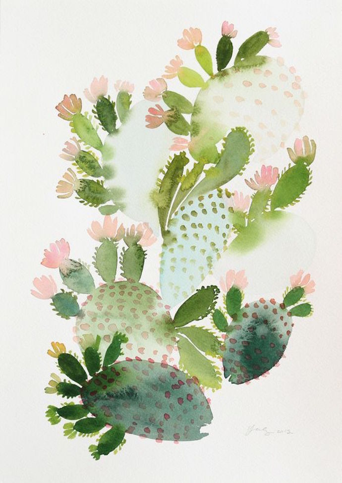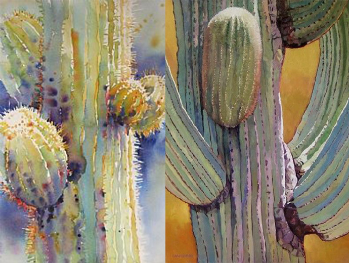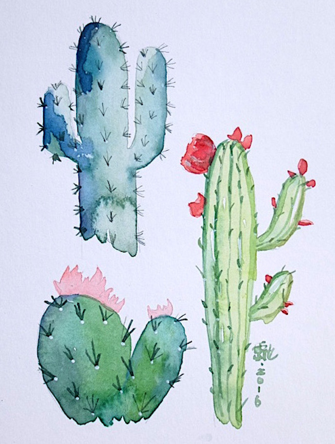 后记:要想画好一幅画,首先线稿的形体要尽量画准,其次是一幅画要表现比较丰富的颜色就要在还没干的时候混色,让两个近似色自然融合,水彩的乐趣就是在干了之后会出现你意想不到的效果;一起挥笔画起来吧。其他的一些仙人掌水彩作品