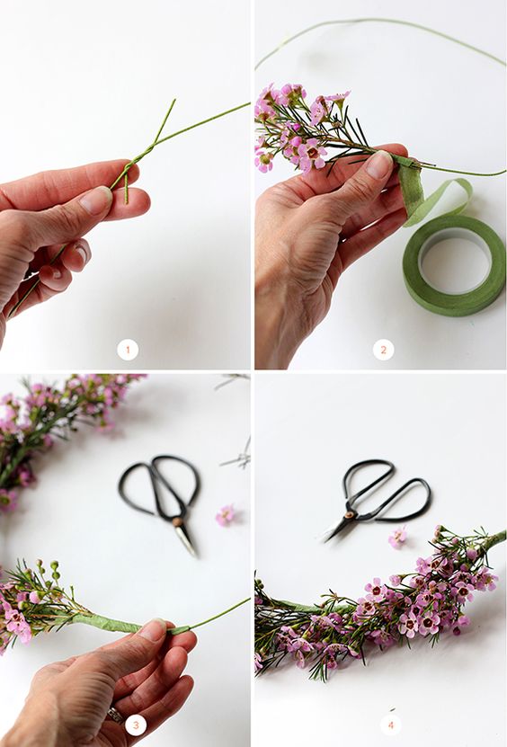 用花艺胶带将鲜花如图缠绕在发卡或铁丝上,为宝贝亲手编织皇冠,圆她一个公主梦。