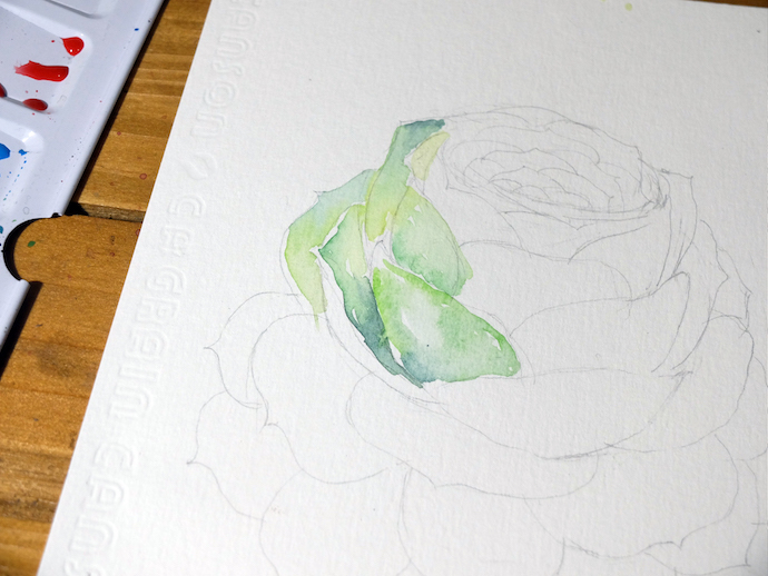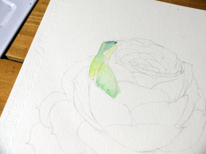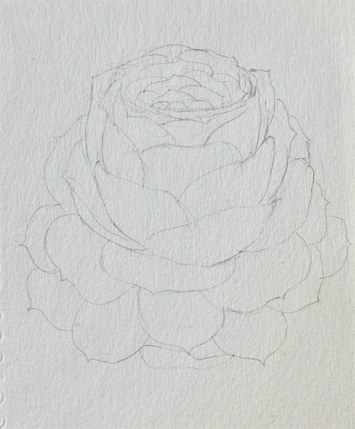 线稿:用铅笔画出山地玫瑰的线稿图,可以先画花心,再依往下画,最后画出展开的叶片。