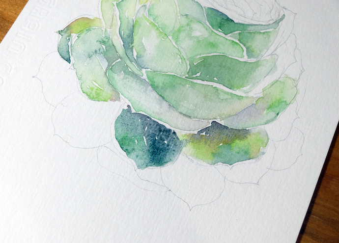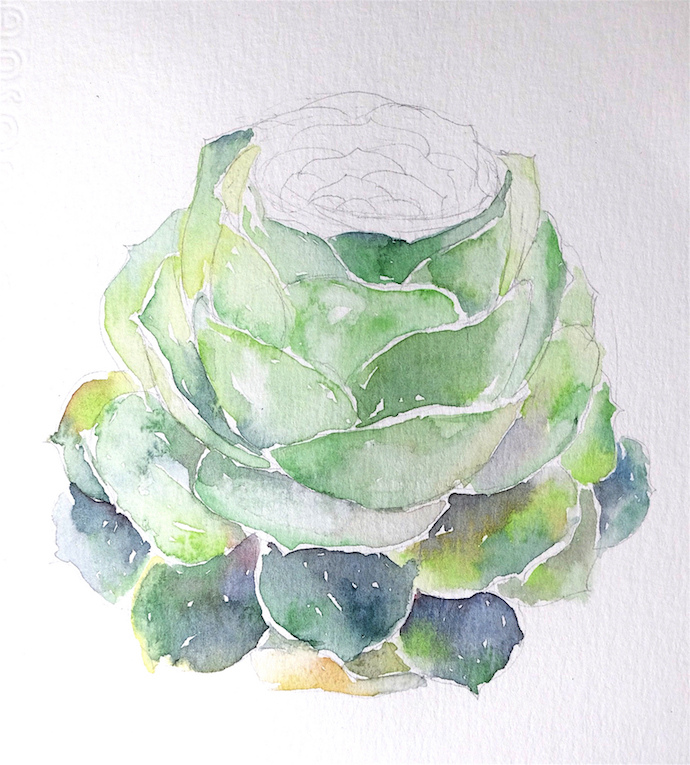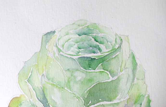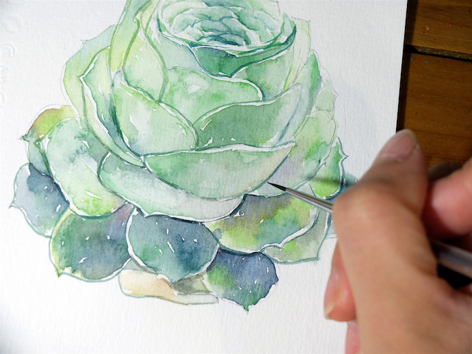 画最下面的叶片:建议从上往下画,多肉叶片每一圈的颜色比较接近,所以这样画比较好控制整体性,也减少了调色的次数。深色的地方可以留一些小缝隙透气哦。