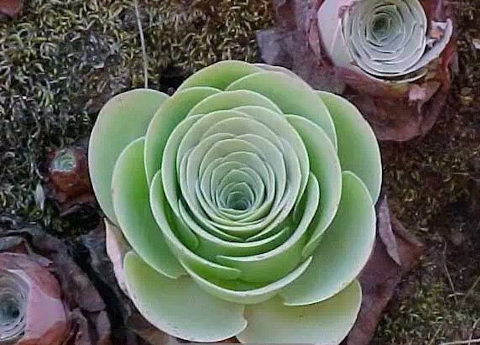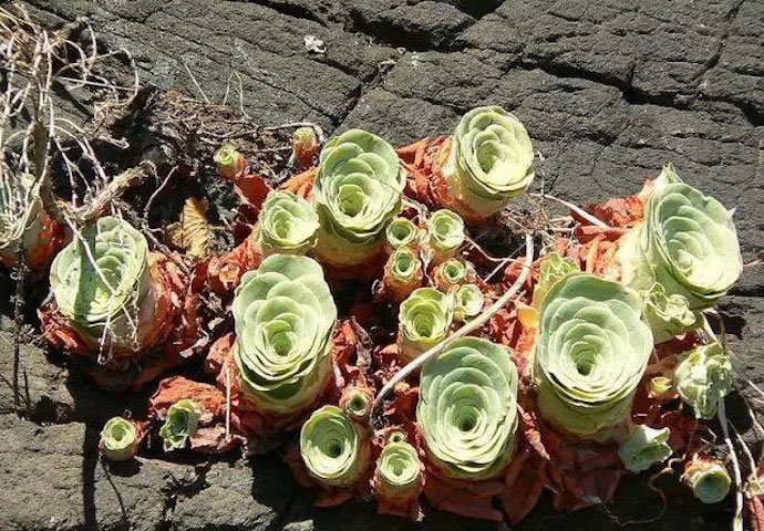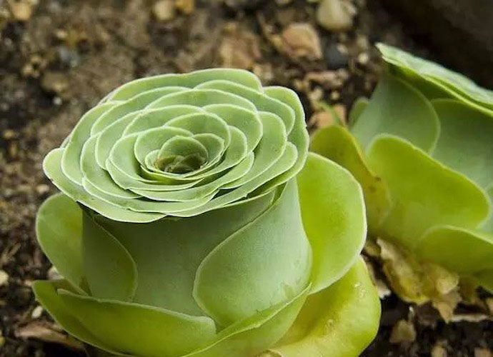 生长期叶子展开,休眠期合拢,肉质叶呈莲座状排列,株幅依品种的不同差异很大,小型种‘Aeoniumaizoon’只有2至4厘米,而大型种‘Aeoniumdiplocyclum’能长到30厘米至40厘米或更大。叶色有灰绿、蓝绿或翠绿等颜色,暴晒后叶子有时会有红褐色斑纹,有些品种叶面上还稍具白粉和绒毛,叶缘有“睫毛”。其花期从暮春至初夏,总状花序,花朵黄色,花后随着种子的成熟,母株会逐渐枯萎,但其基部会有小芽长出。由于山地玫瑰开花后会死亡,种植过程中要注意保留种子和侧芽。