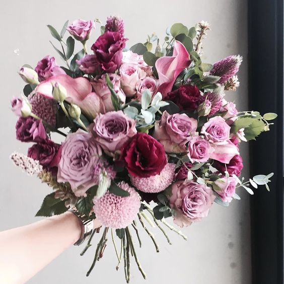 成熟妩媚的女生一定是充满着女人味道的尤物,她们自信有韵味,和芍药、玫瑰这种花瓣层叠多且有波浪曲线的花材十分相配。以红色、紫色搭配的花束很适合这类性格的女生,