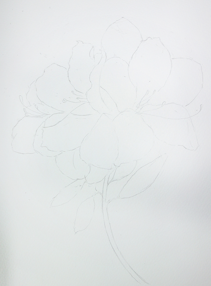 用铅笔在纸上勾勒出杜鹃花的大体比例。