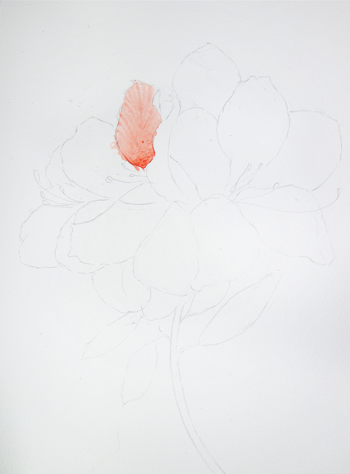 大红加橘红铺垫根部,再用干净的清水笔将其向花瓣的尖尖部分晕染开来。