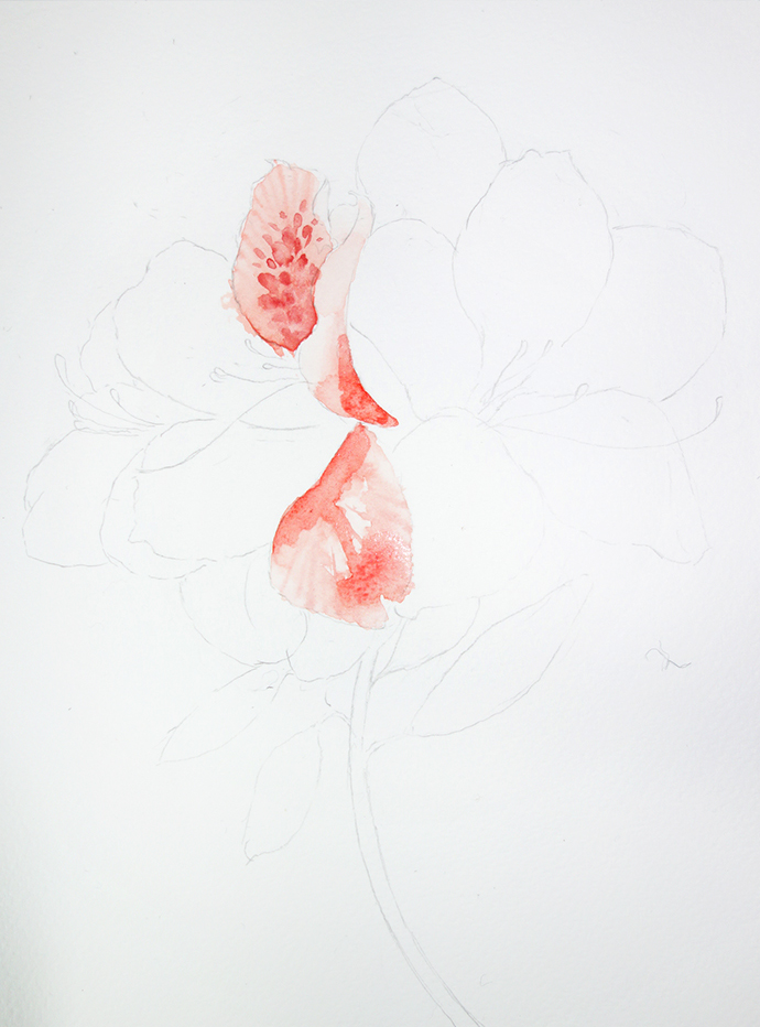 大红加橘红铺垫根部,再用干净的清水笔将其向花瓣的尖尖部分晕染开来。用深一些的红色绘出花朵的脉络。