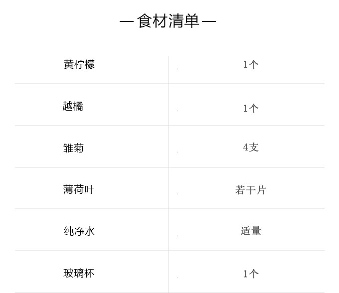 将柠檬和小越橘切成薄片,根据杯子的容量来选择你的切片数量。选取可食用的新鲜小雏菊和薄荷叶,来提升柠檬的清香。用镊子依次把原材料混搭放入玻璃杯中,增加整体美感。