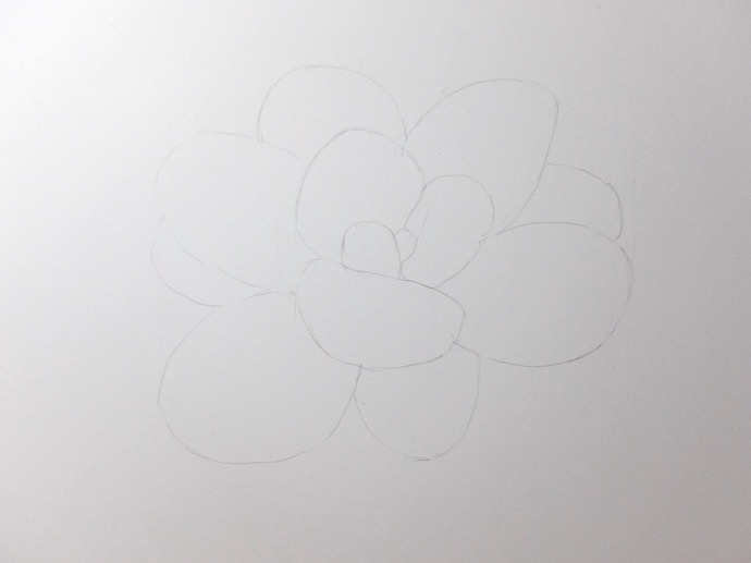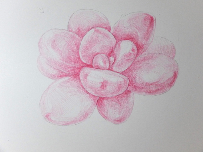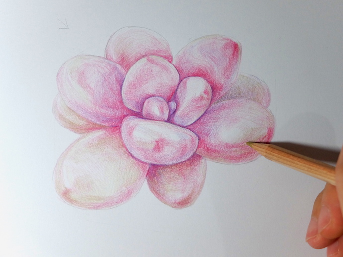 作品名称 / 彩铅手绘多肉植物-桃蛋用自动铅笔画好桃蛋的线稿,桃蛋的叶片呈椭圆装,叶片较少,需要注意叶片之间的比例大小和分布。