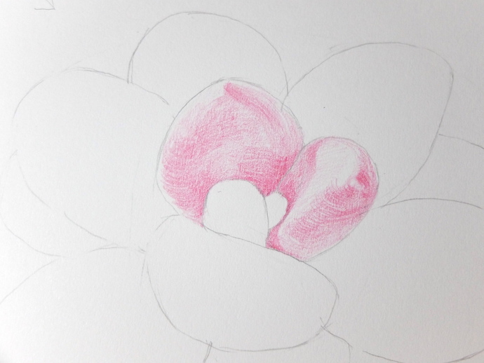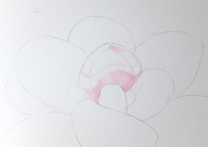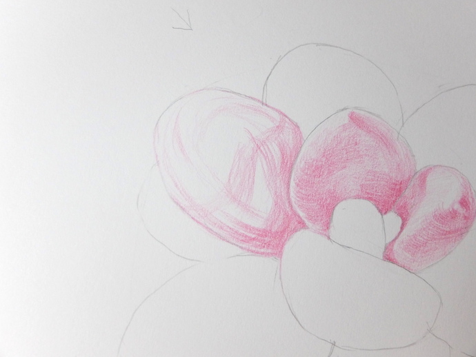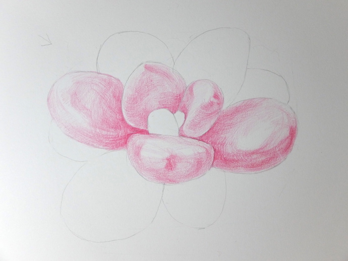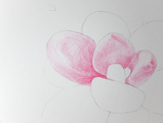用大红色彩铅先画出叶片的结构关系,确认光源为左上方,然后根据叶片的体积和光源画叶片的背光面。