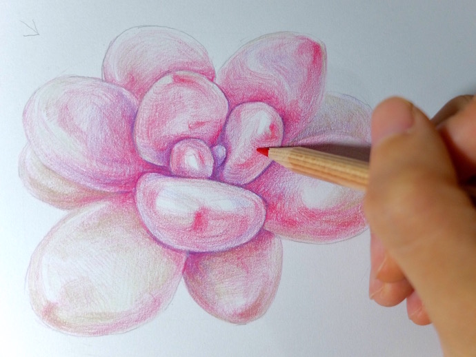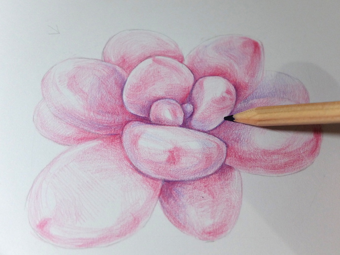 用蓝紫色彩铅加深叶片的阴影和部分暗部的调子。