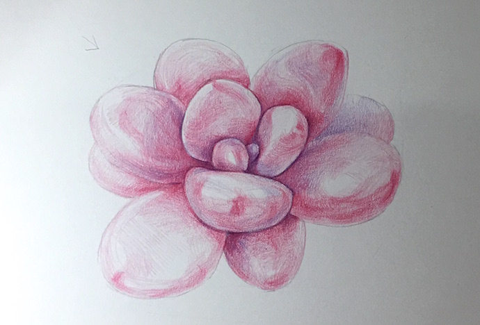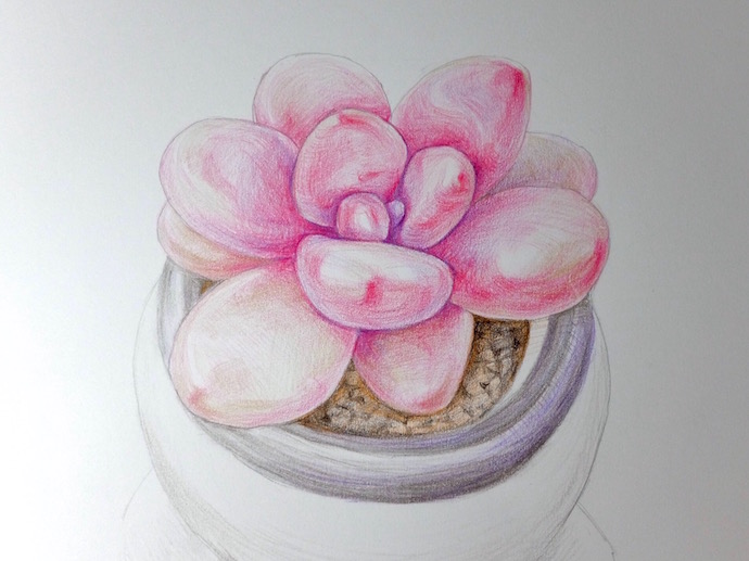 最后用赭石和褐色彩铅画颗粒土,紫色和黑色简要的勾勒出花器,作品完成 。