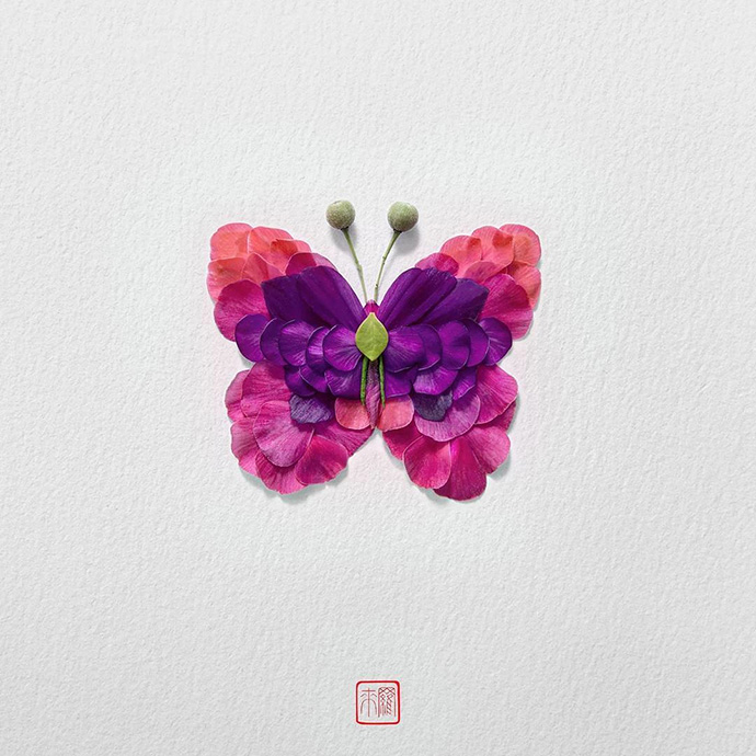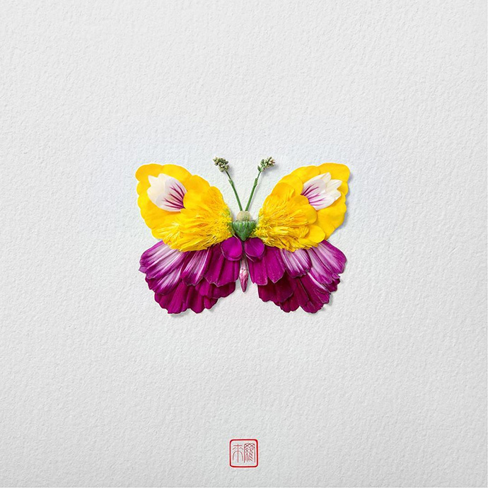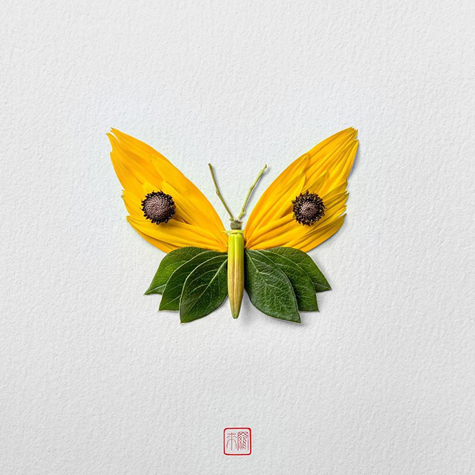 Raku Inoue井上罗来以往的作品是将植物拼贴组合成各种昆虫的造型,比如蜻蜓和各种造型不同的甲虫,近期新作,他重点制作了一批蝴蝶。