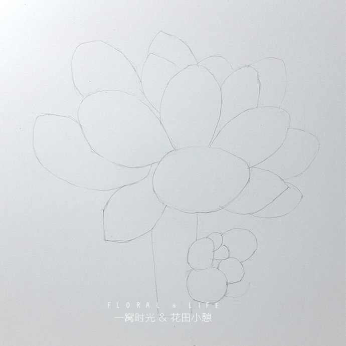 线稿:用铅笔画出婴儿手指的线稿,画的时候可以先确定中间几个主要的叶片,再画周边的叶片,婴儿手指叶片像椭圆形,要画出中间胖,两