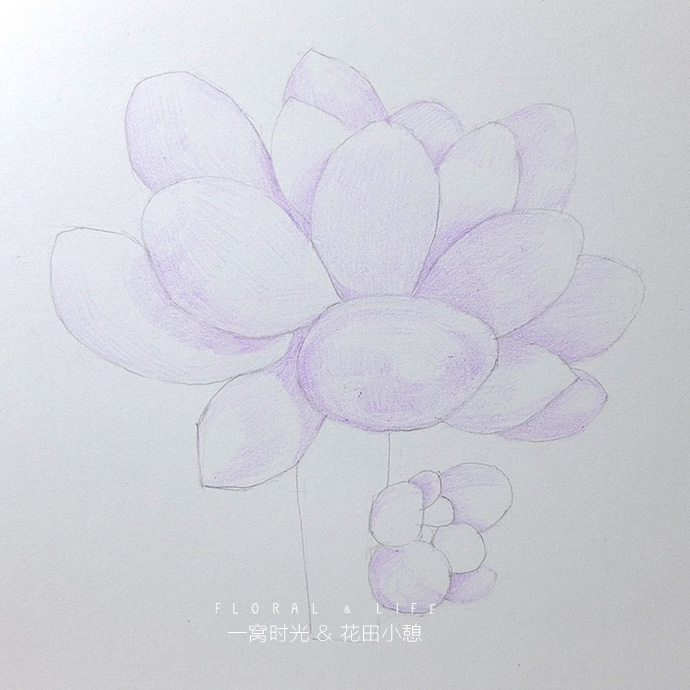 紫色上色:先用紫色给婴儿手指铺第一遍颜色,画的时候尽量顺着婴儿手指叶片生长的方向画,用力均匀,排线紧密,阴影的地方叠加第二遍颜色,留出高光,加深明暗交界线,画出体积感.