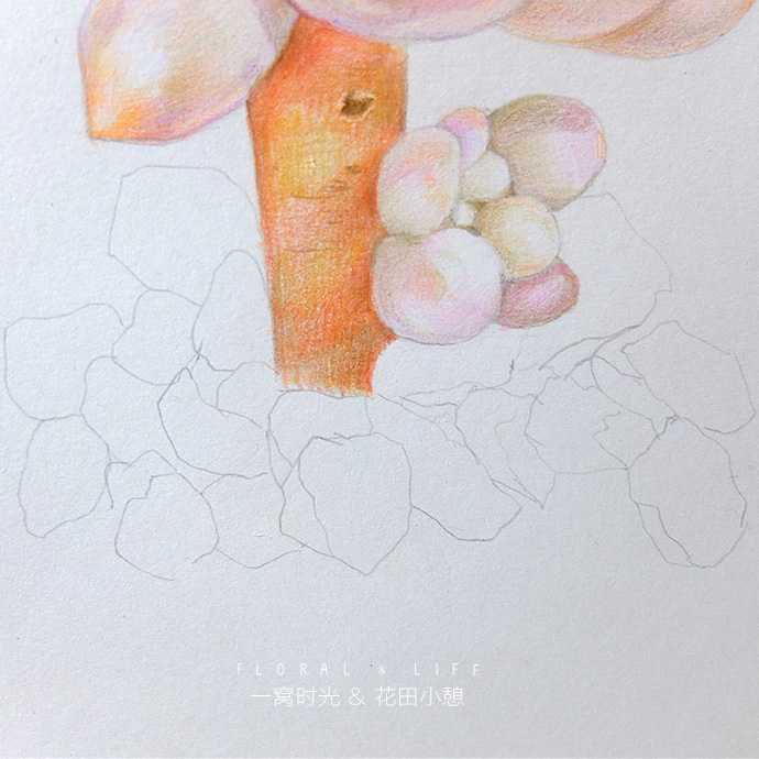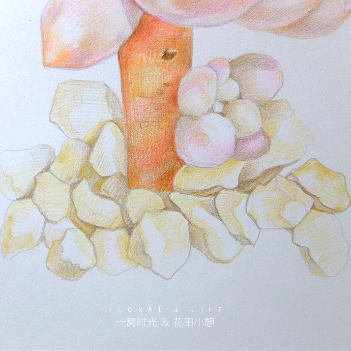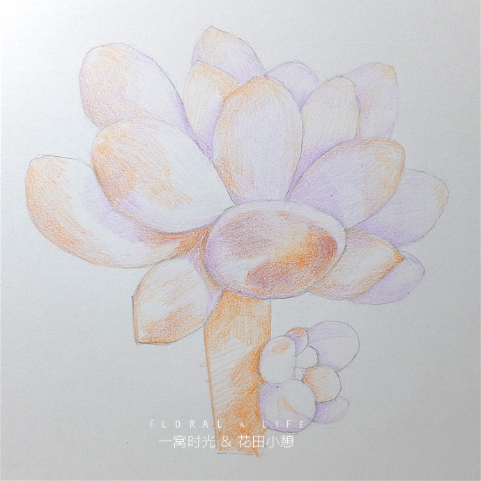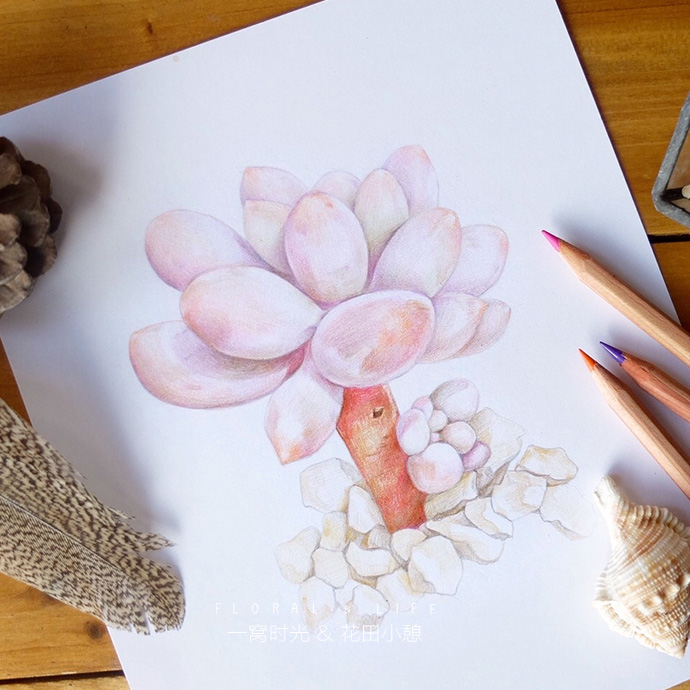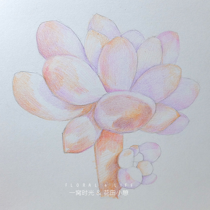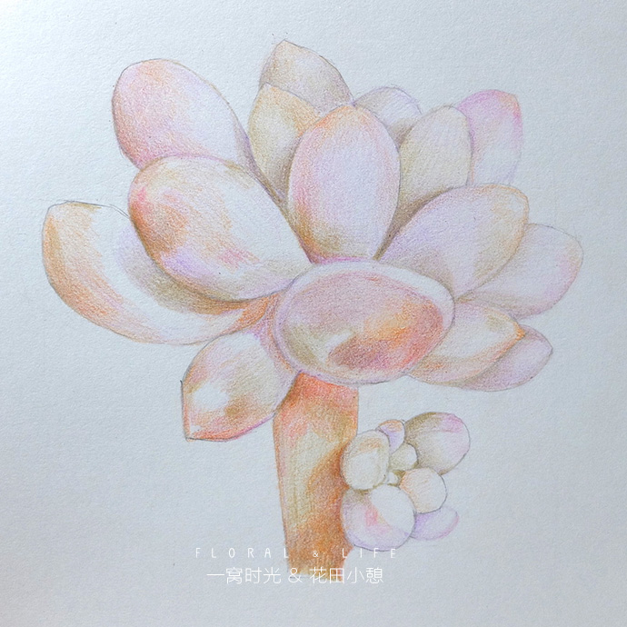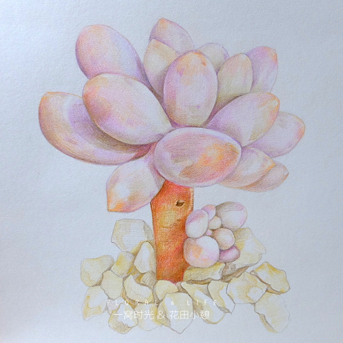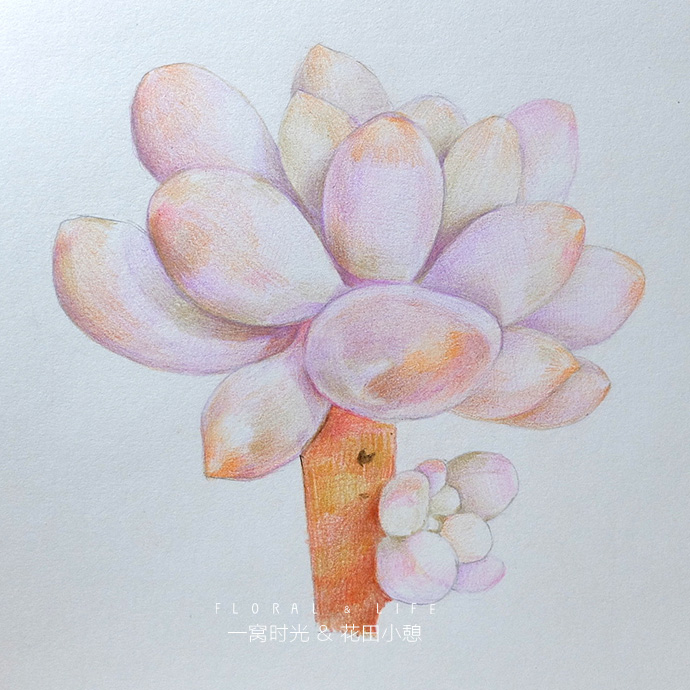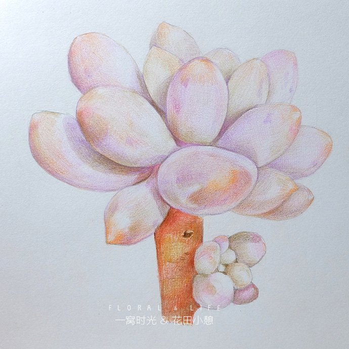 后记:画婴儿手指的难度在于怎么表现叶片白霜的质感,白霜一般偏蓝紫色,但整体看上去颜色又是白白粉粉的,所以方法就是轻轻的上一层紫色,然后把叶片深的地方加深,增强对比,就能体现白霜的感觉啦,赶快试试吧!
