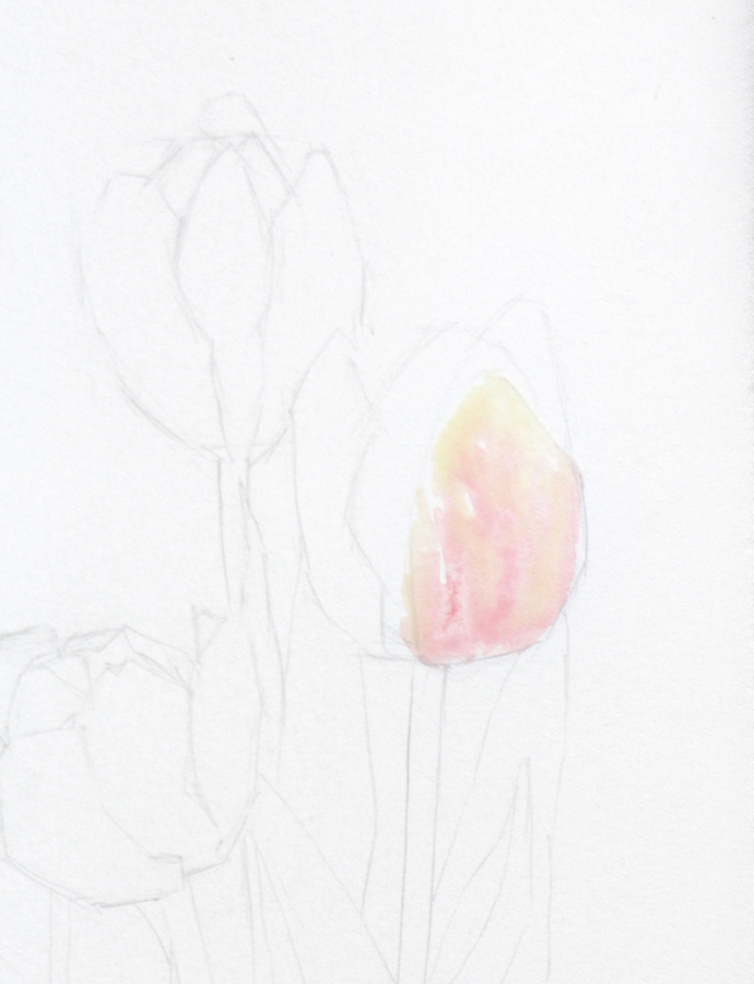 浅绿加少量黄色调和大量水给花径上色,花径是圆柱形,所以要表现出体积感需要中间亮一点,要有一些变化。