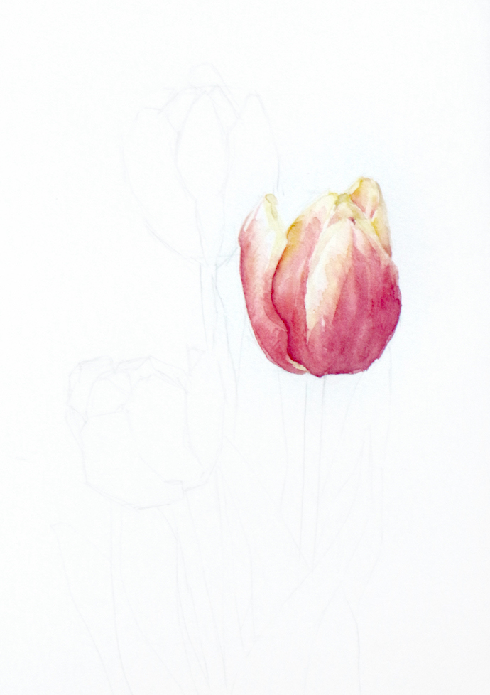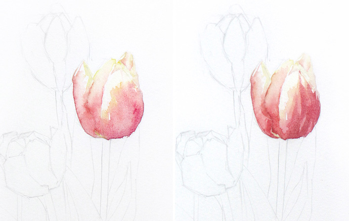 画下一朵:用上面的方法先铺大调,花瓣边缘留白,用深浅对比突出花瓣的层次。