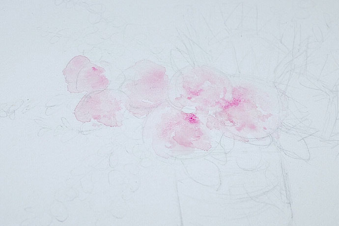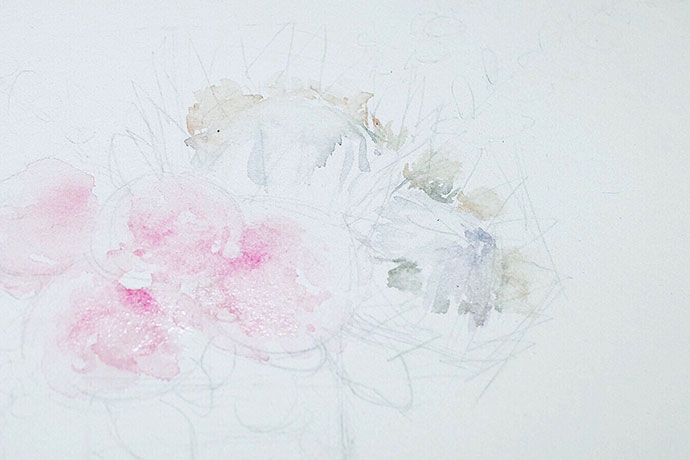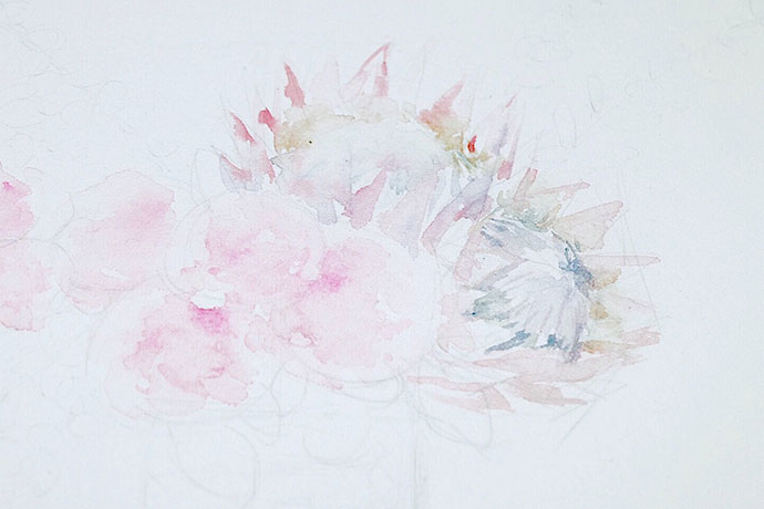 给花园玫瑰铺大调:用玫红调和大量水画花园玫瑰,花园玫瑰的特点是中心深边缘浅,并且花瓣似蕾丝不成形,所以上色的时候可以利用水的晕染来制造这种若有若无的效果。
