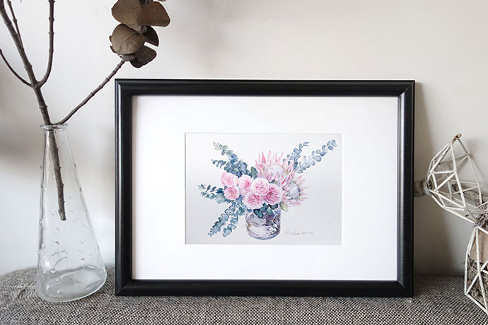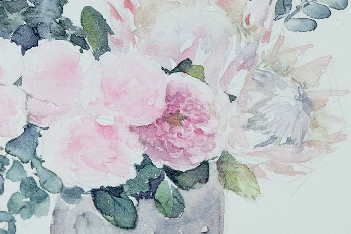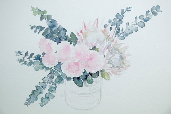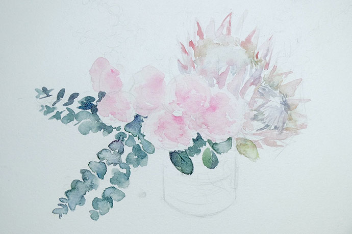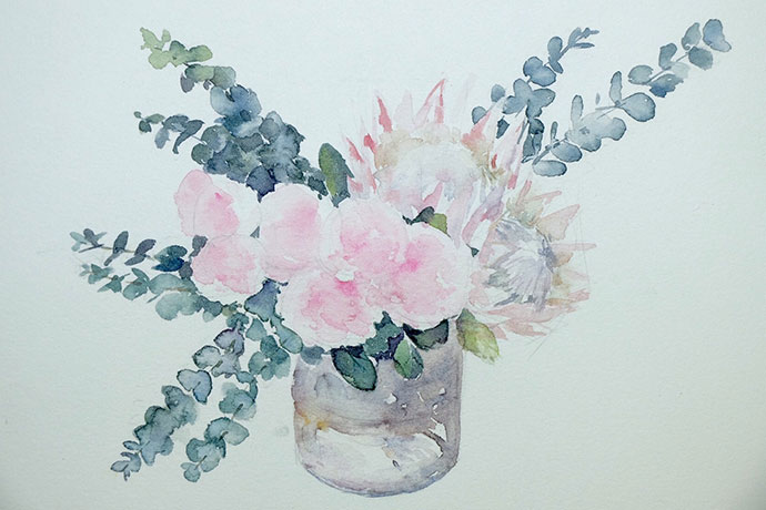 画高光:用白色点缀玫瑰花瓣的高光,勾勒帝王花部分花瓣边缘和花蕊,再画出尤加利枝干的亮面,作品就完成啦!