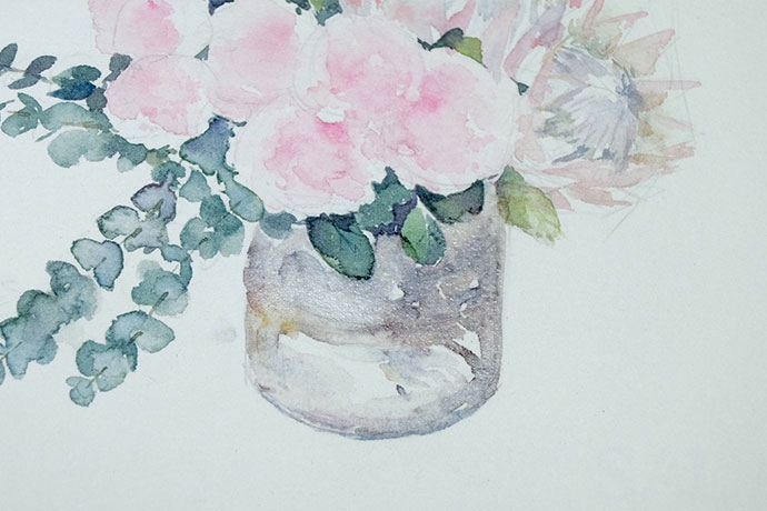 给花瓶铺色:赭石加少量群青调和大量水给花瓶上色,注意亮的地方要留白。