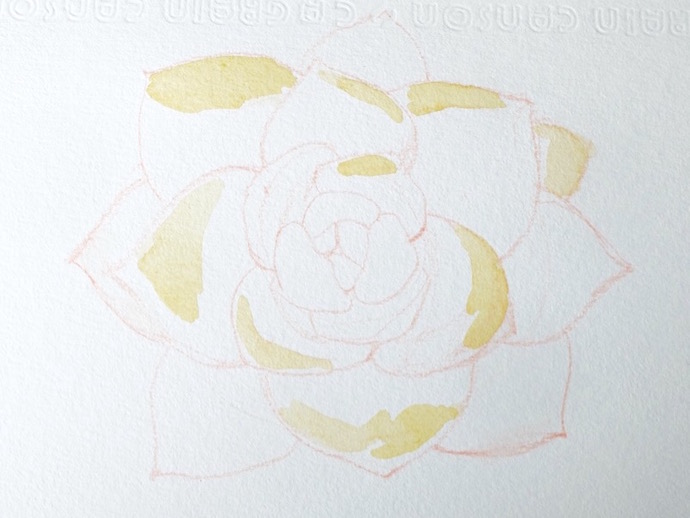 用橙色的水溶彩铅画线稿,上色的时候水溶彩铅会融合到色彩里,边缘会比较自然,没有把握的画友可以先用铅笔打线稿哦;中黄色调和大量水画叶片尖端的暗面。