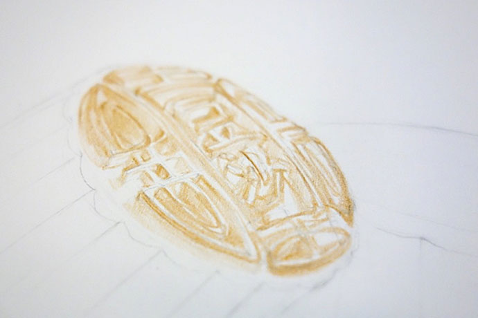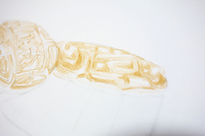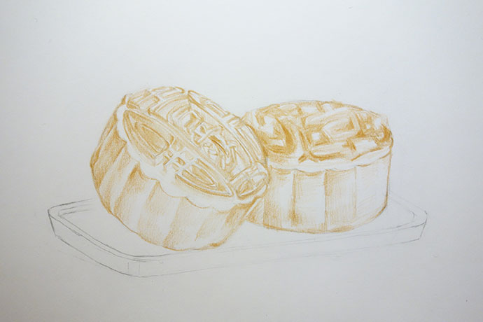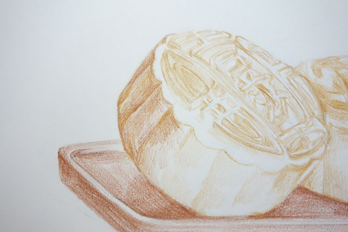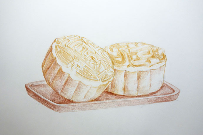 画另一个图案:用赭石色彩铅画出另一个月饼的图案,画出暗面留出亮面就会有立体感哦。