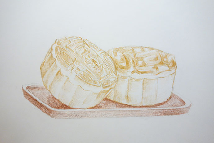 加深月饼侧面:用褐色加深月饼侧面,画的时候注意明暗关系,纹路最深的地方颜色越深。