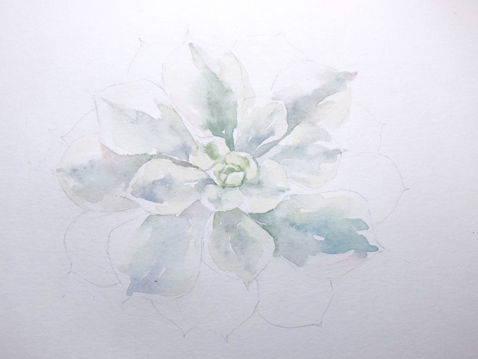 浅绿加大量水画中间叶片和外面两片叶子的两侧,加少量普兰画叶片中间灰蓝色,加少量草绿画叶片中间深色和中间叶片的阴影。