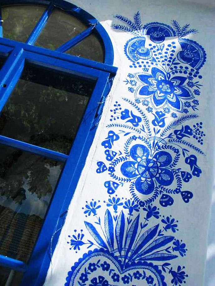 当地的房子大多是白色的墙壁,而安妮卡奶奶只用群青蓝色颜料涂画花朵主题的壁画,蓝色的花朵在白色的背景下显得非常清新可爱。