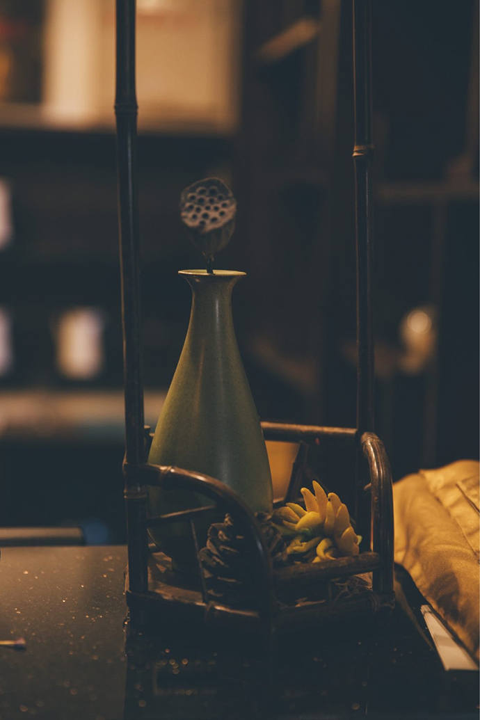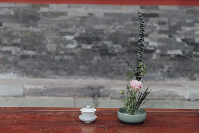 — 中式插花重视花枝的姿态与神韵,造型注重线条美,潇洒自然,而尤加利叶是典型的线性花材,搭配翠扇等植物,表现出自然天成、意境深邃的生命之美。中心位置点缀一朵粉色洋桔梗,颇有清闲淡雅、超凡脱俗之姿。