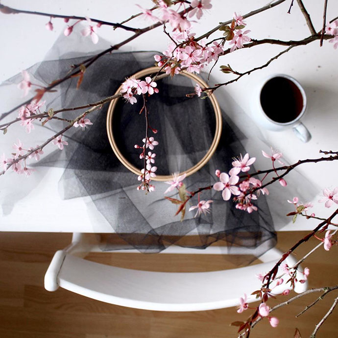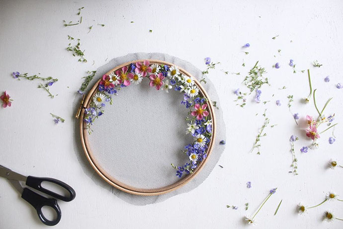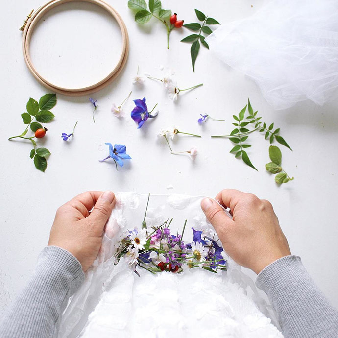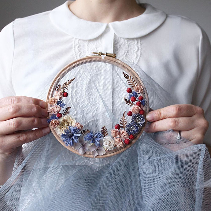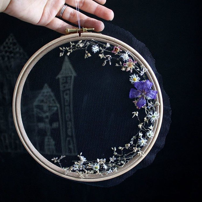 Olga Prinku有一个非常独特的创意:将花朵、绣绷、纱网这三样事物结合在一起。