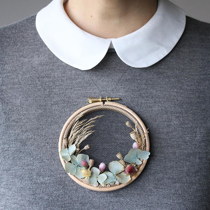 一般绣绷上使用的都是棉布,而Olga Prinku用透明的纱网来代替不透明的棉布,再把鲜花或者干花精心排列在上面。透明的纱网让鲜花显得更加轻巧灵动!