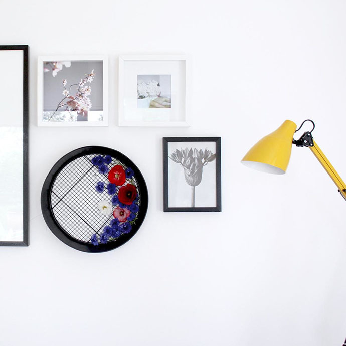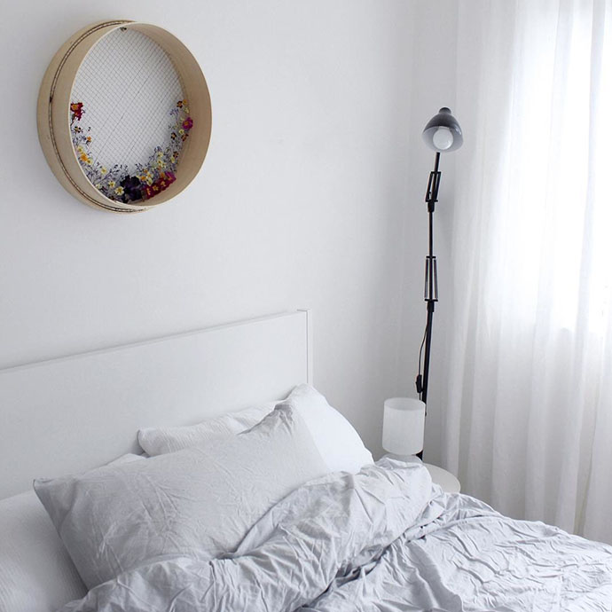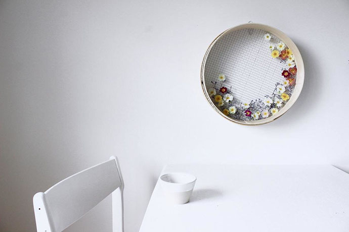 除了绣绷,Olga Prinku还将花花草草跟厨房用的筛网结合,变成了最自然的墙面装饰。